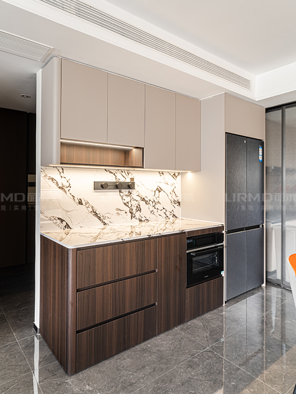 懸浮柜+意式發光薄柜的搭配,立體效果絕了,和整個空間色調完美融合,干飯儀式感都變足了